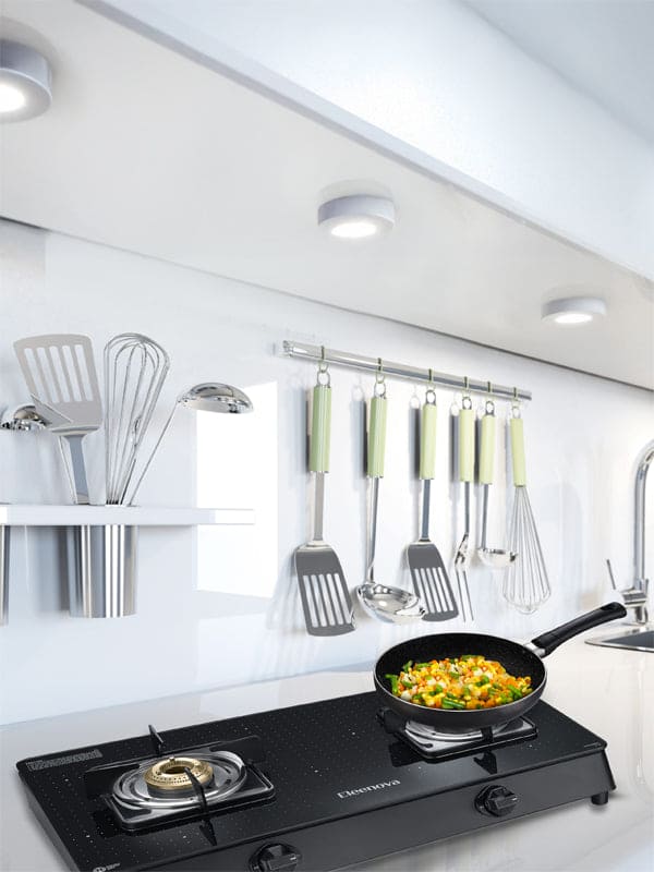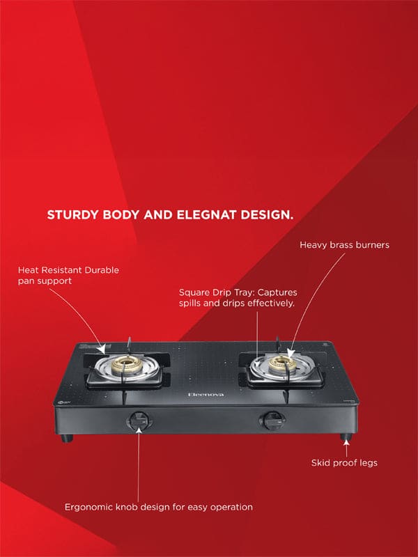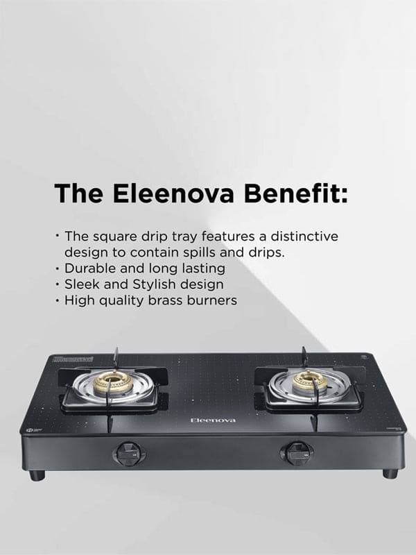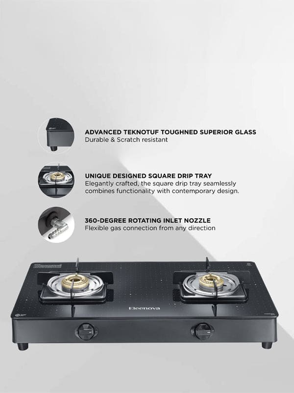 Elevate your kitchen with Eleenova’s Constellation Gas stove, blending durability and elegance. Featuring scratch-resistant teknotuf superior toughened glass for easy cleaning and lasting performance. Its efficient brass burners ensure uniform heating, and a special jumbo* burner provides quick, high intensity cooking. With a 360-degree rotating inlet nozzle and ample space between burners, it’s perfect for modern kitchens. Transform your cooking space into a stylish oasis of functionality. Enjoy high performance, efficiency, and style with Eleenova’s Constellation range of gas stoves.