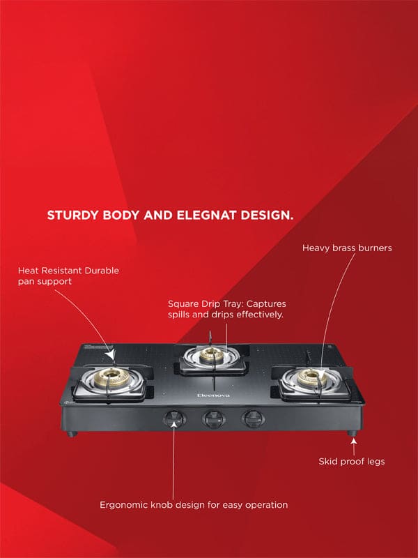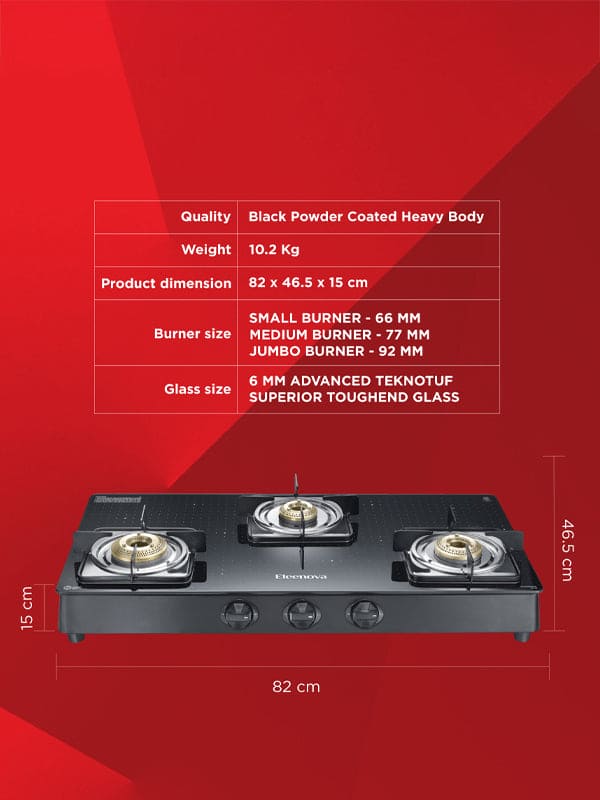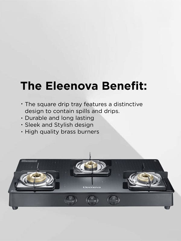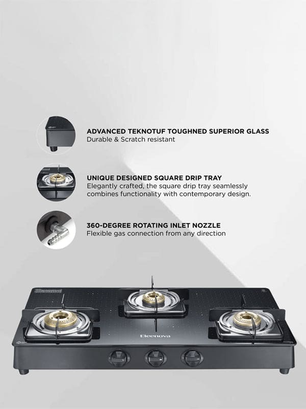 Elevate your kitchen with Eleenova’s Constellation Gas stove, blending durability and elegance. Featuring scratch-resistant teknotuf superior toughened glass for easy cleaning and lasting performance. Its efficient brass burners ensure uniform heating, and a special jumbo* burner provides quick, high intensity cooking. With a 360-degree rotating inlet nozzle and ample space between burners, it’s perfect for modern kitchens. Transform your cooking space into a stylish oasis of functionality. Enjoy high performance, efficiency, and style with Eleenova’s Constellation range of gas stoves.
