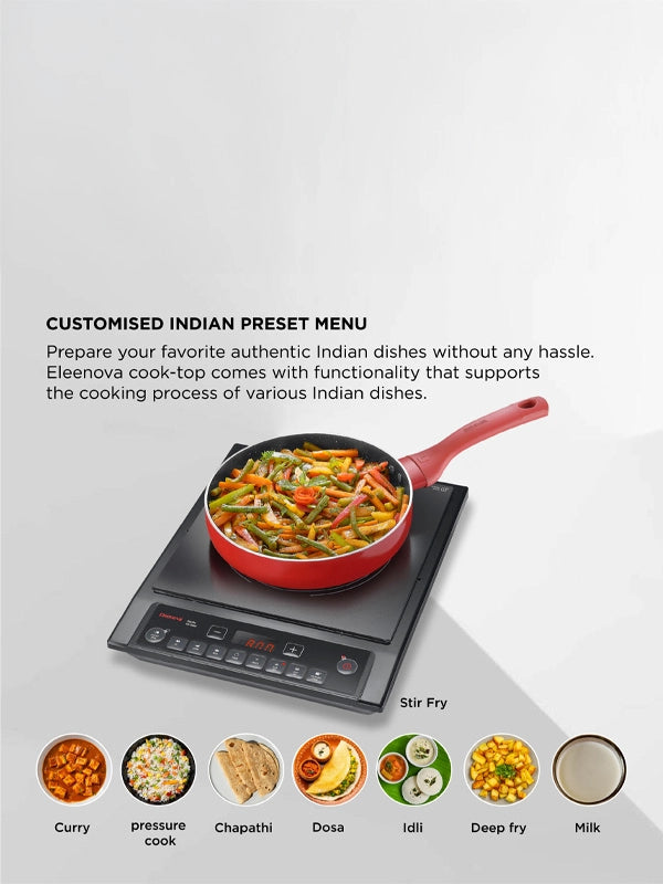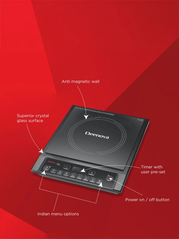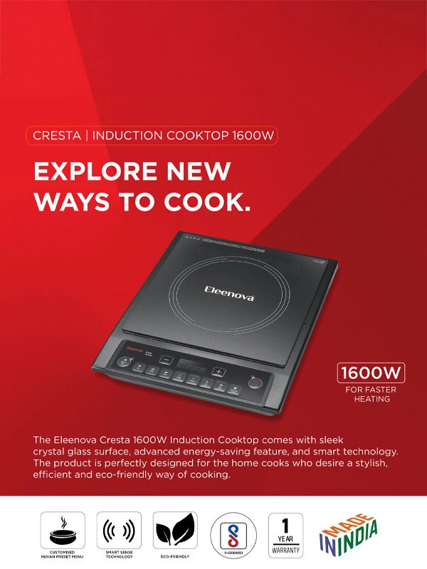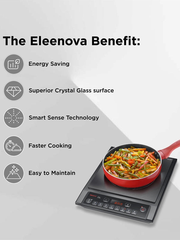 The Eleenova Induction Cooktop, designed and manufactured with durable crystal glass, prioritizes convenience & eco-friendliness. It offers preset menus tailored for perfect Indian dishes and integrates energy efficiency. Featuring Smart Sense technology and easy push buttons, this cooktop ensures safe, quick, & cost-effective meal preparation. Its the ultimate choice for savvy home chefs seeking reliability and a sustainable cooking experience.
