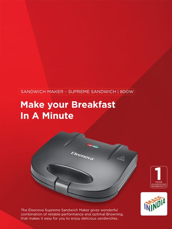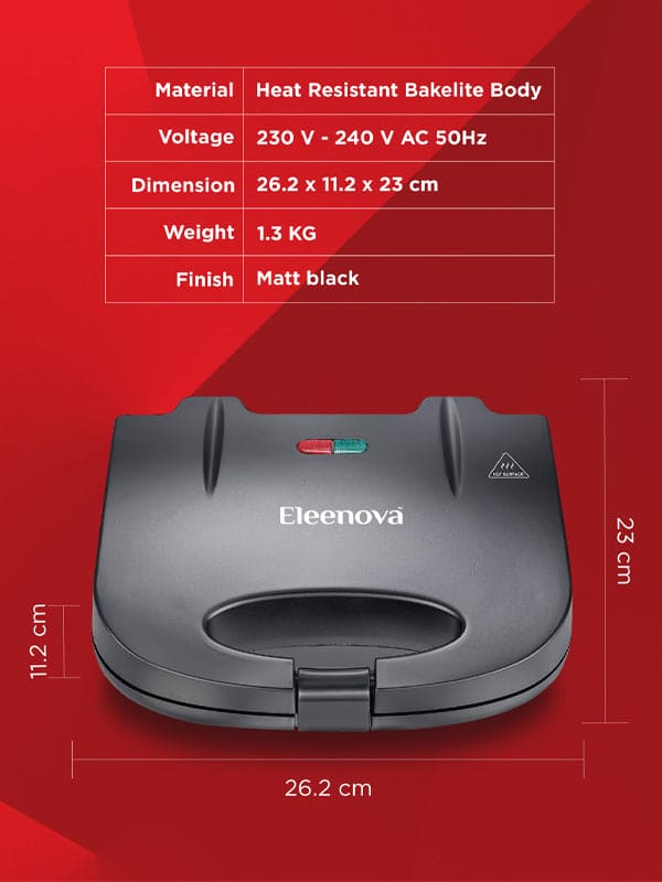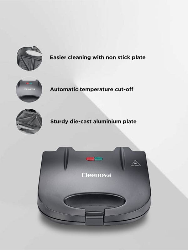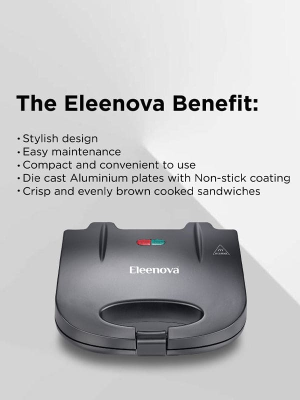 Experience the ease of crafting healthy and delicious sandwiches with the Eleenova Sandwich Maker. Its non-stick plates require minimal oil, ensuring a healthier option for your meals. Elevate your kitchen with this convenient and stylish appliance. Save time with quick and easy sandwich preparation, using your favourite ingredients for a wholesome breakfast or snack. The Eleenova Sandwich Maker is your go-to solution for satisfying sandwich cravings with flair and convenience.